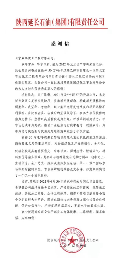 在北京石油化工工程有限公司總承包的延長石油榆神能化50萬噸/年煤基乙醇項(xiàng)目緊鑼密鼓、加快建設(shè)的關(guān)鍵時(shí)期,12月29日,陜西延長石油(集團(tuán))有限責(zé)任公司向我公司發(fā)來感謝信,對(duì)我公司2021年乙醇項(xiàng)目建設(shè)工作給予了充分肯定和高度評(píng)價(jià)。