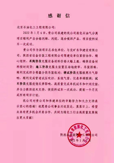 項目建設期間,面對工期緊張、場地狹窄、設備吊裝困難等諸多不利因素,項目組全體人員,精心策劃,合理安排施工計劃,緊盯節點目標,有效推進了項目建設進度,提前一個月完成所有項目計劃。為此,陜西未來能源化工有限公司發來感謝信,對我公司在項目建設中付出的努力表示感謝,對項目試車成功表示祝賀!