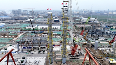 據悉,兩臺乙醇脫氫塔為項目首次進行超百噸以上設備吊裝。吊裝前,項目組在大件吊裝專家論證、吊具調度、施工環節有序銜接、過程質量把控、安全操作及監控等環節進行了有效策劃及充分準備,確保了設備順利吊裝,并為后續三臺組裝塔器的順利吊裝積累了寶貴的經驗。(通訊員/黃耀輝 攝/王超)