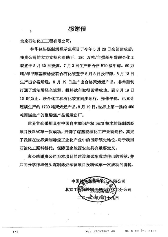 中國神華煤制油化工有限公司發來感謝信